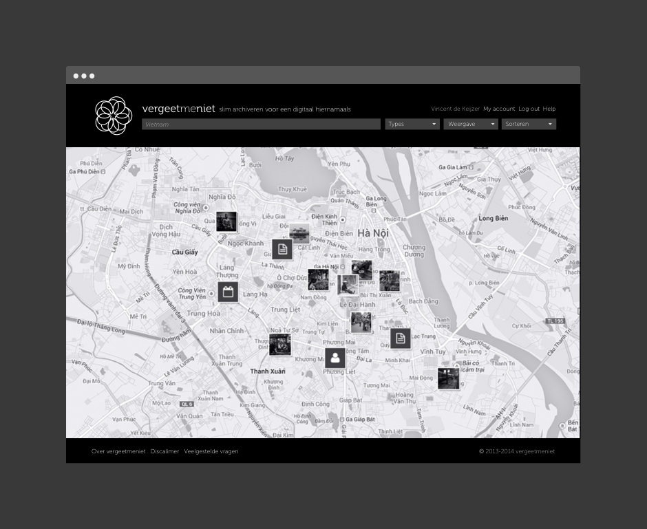 vergeetmeniet Logo and interface design Vergeetmeniet(rememberme) helps people manage their digital collections. Collection objects are archived with a clever tagging system and searchable in different views like time, location, relations and many more.